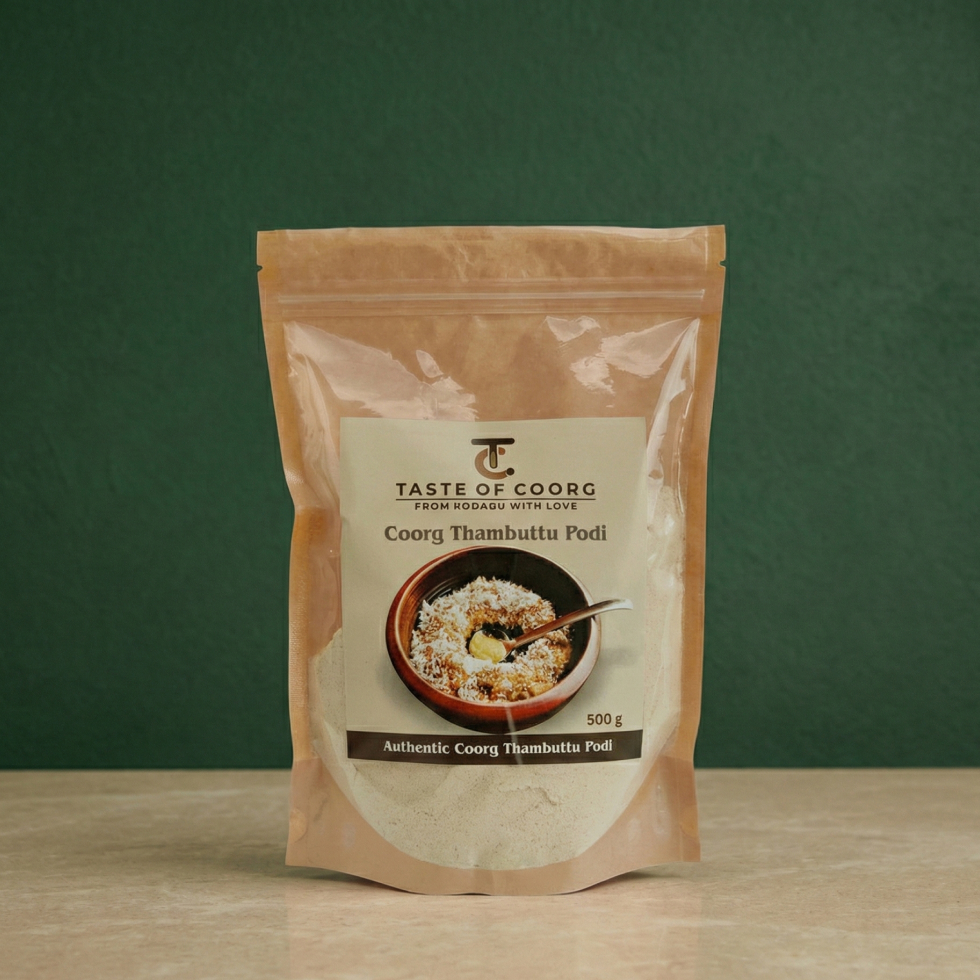 Experience the rich flavors of Coorg with our Thambutt Podi. Additionally, Thambutt Podi serves as the base for several traditional Coorgi dishes such as Thambutt, made with banana, and Berambutt, made with jaggery and coconut etc.